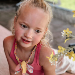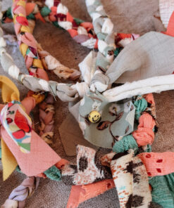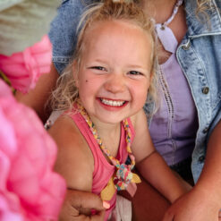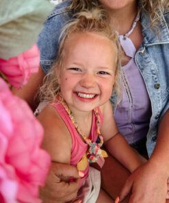 Een vrolijke ketting met bedel, draagbaar op verschillende manieren, beschikbaar in kinder- en volwassenmaat, perfect om te twinnen, handgemaakt en duurzaam.